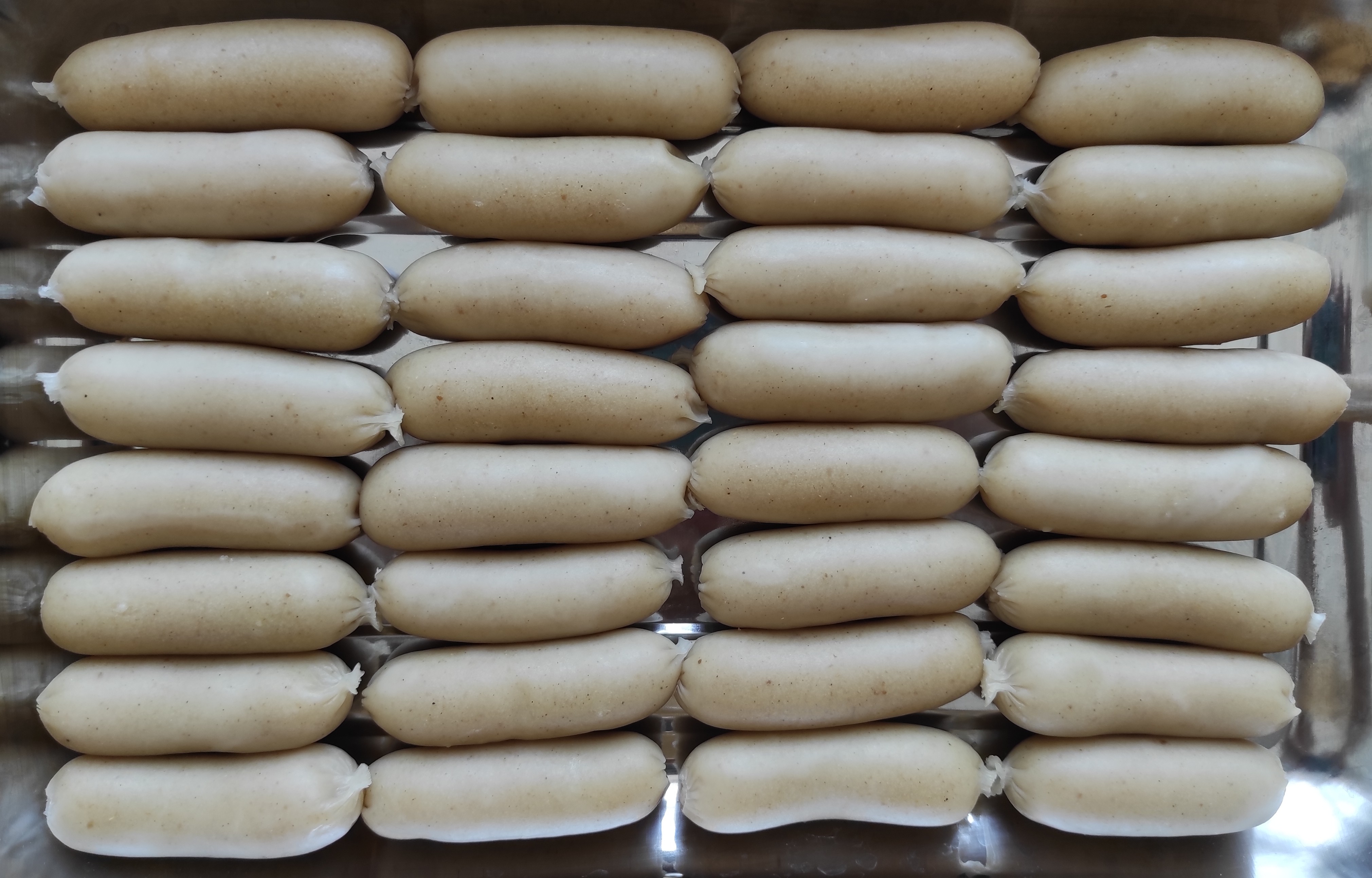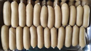 - Masukkan adonan sosis dalam selongsong (opsional) atau cetaklah adonan dalam cetakan sosis.